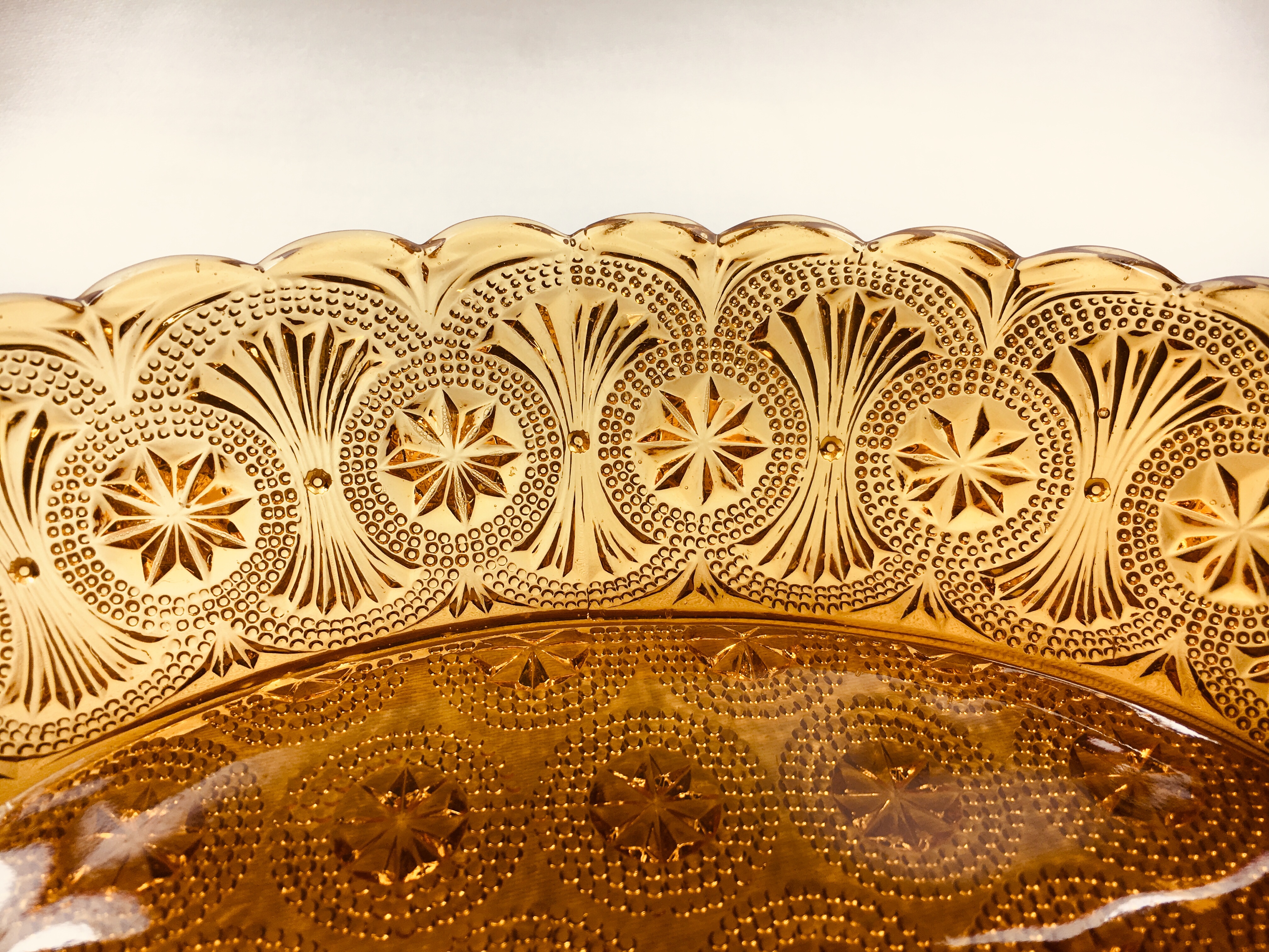 It is a striking design consisting of stars surrounded by three concentric circles of dots. The edges of the dish also have a mirrored fan design between the circles.