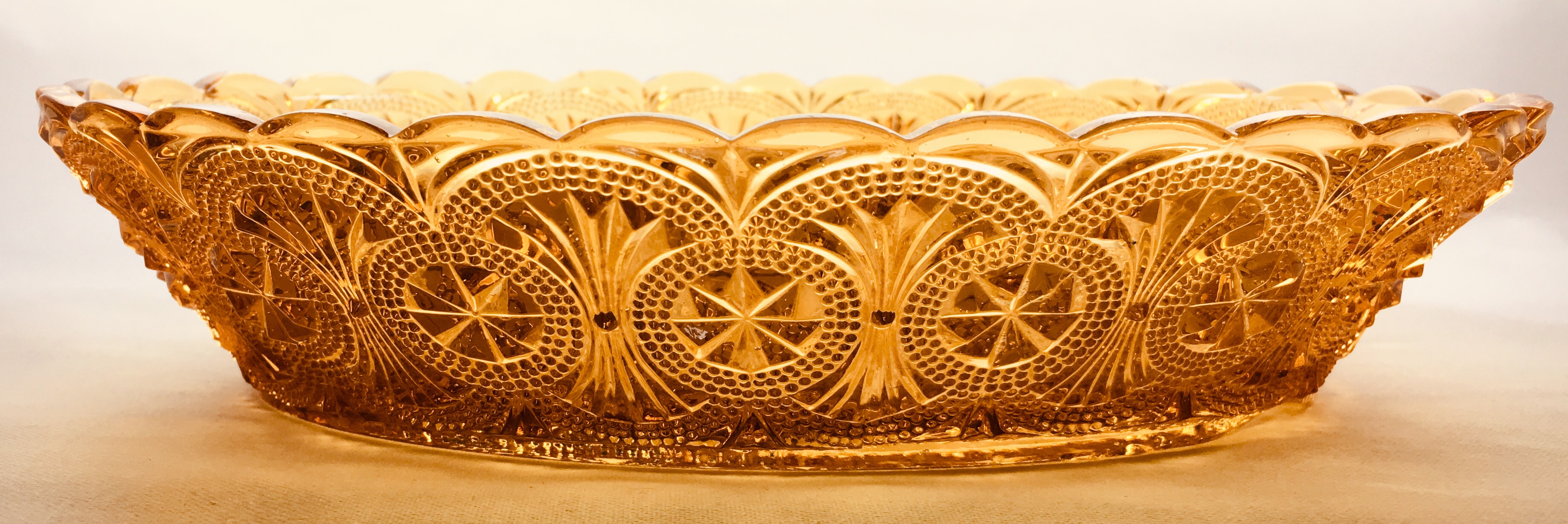 This dish is oval in shape, with a scalloped rim and flat base (no feet). It measures 9¼” long, by 6¾” wide and 2″ high.