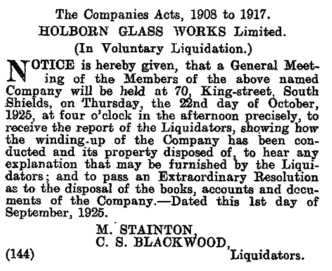 Holborn Glass Works Ltd. was incorporated in 1920, company number 1669121. Due to the economic depression of the 1920’s, the company was not a success2 and went into voluntary liquidation on 7th June 19223, after only two years. The creditors meeting was held on 16th June, 19224 and the company was finally wound up in September 19255.