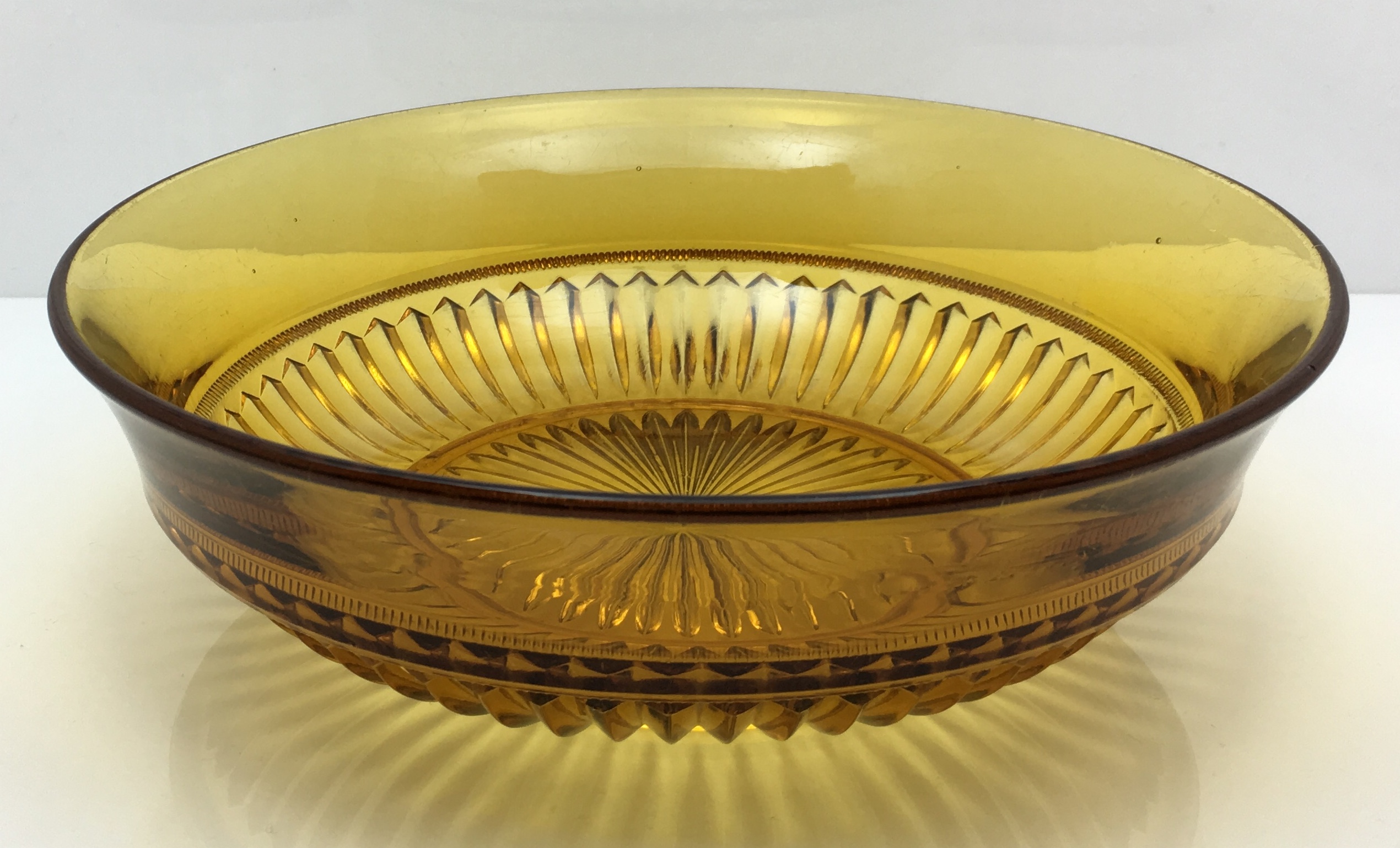 Holborn Glass Works Ltd. is not mentioned in any of the core books on the subject of English pressed glass, nor are there are references to the company, catalogues or pattern books in the Tyne & Wear archives or the V&A archives. Due to the lack of pattern books and catalogues, it is not known what products were made by the company, or the colours of glass used during manufacturing. During the short time the company was in production only one design was registered, number 684000, on 6th July 192115. As far as I am aware, the amber coloured, pressed glass bowl below is the only surviving example of glassware from Holborn Glass Works Ltd.