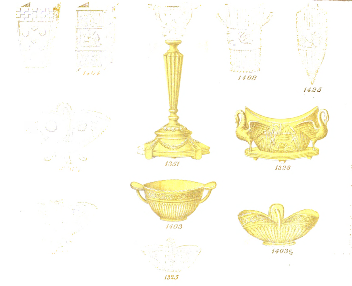 There are two pattern sheets for glass shown in the book. The first is a very clear image of three pieces of blown and cut glass from Thomas Webb & Son, in May 1879, on page 304. The second, the New Patent Queen’s Ivory Ware in pressed glass from Sowerby & Co, Ellison Glassworks, Gateshead, which featured in the November 1879 edition on pages 497-498. Unfortunately the scan of the second pattern sheet is quite faded in places. However, the Queen’s Ivory Ware sheet is reproduced in Raymond Slack’s English Pressed Glass 1830-1900, on page 33.