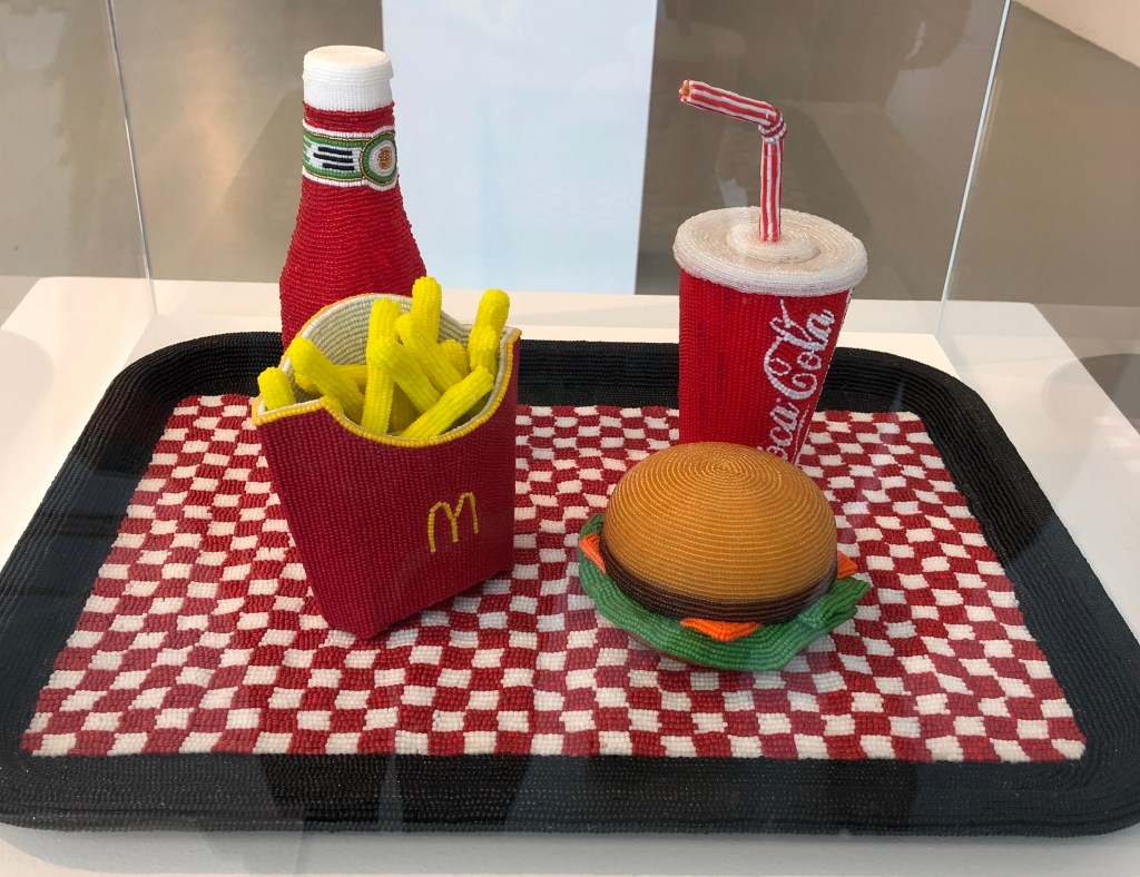 The first piece is a tray containing ketchup, coca-cola, burger and fries. The seed beads looked like 2mm size on the tray and 1mm size for the food items, and there are thousands in this piece. The following case contained a can of orange pop with fried egg and toast. Whilst other framed pop art style pieces, by Faranak Sohi, adorned the walls next to these cases.