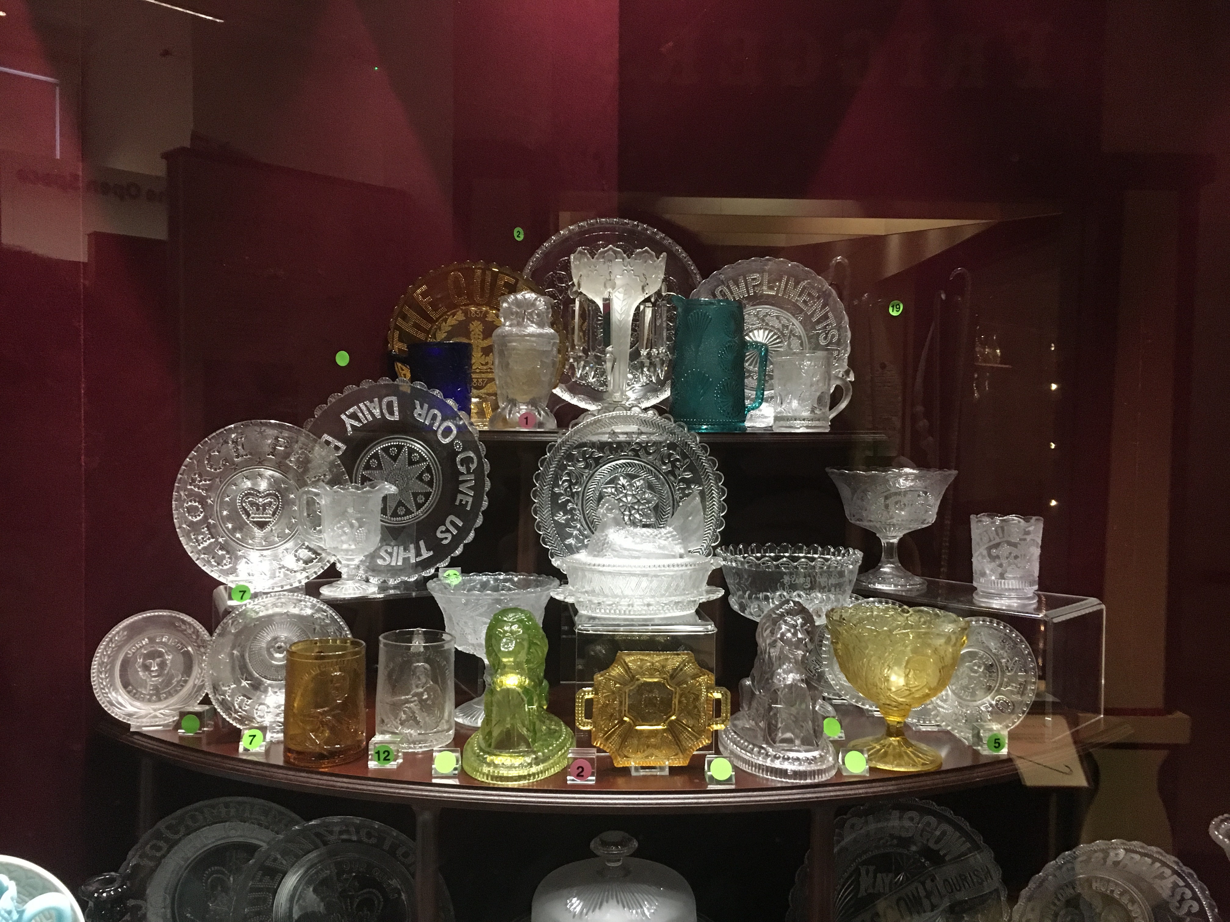 The information panel for the pressed glass displays include a list of registration numbers with numbered coloured stickers, to enable visitors to identify the pieces in the cabinets. Unfortunately the cabinets were so crowded it was not always clear which piece of glass the coloured disc related to. Furthermore, several of the registrations listed were either not present in the display or had not been numbered.