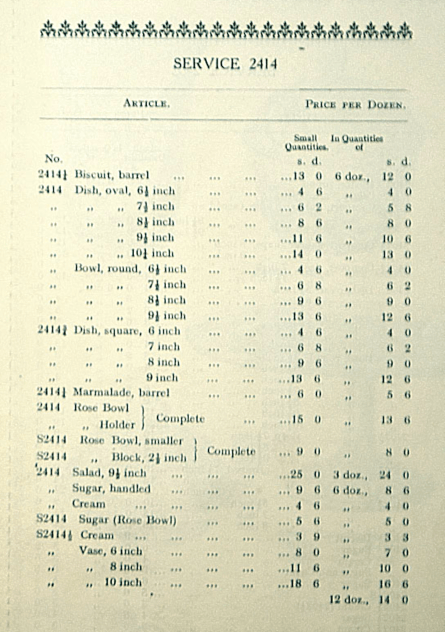 The following table details the individual items manufactured as pattern #2414 (Derby) with descriptions, dates, sizes and catalogue images compiled from various Sowerby catalogues.