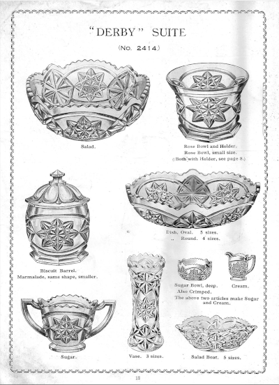 Sowerby’s Ellison Glass Works introduced Service 2414 in Pattern Book 22 in 1925 [1]. The service was renamed to the “Derby” Suite around 1930 [2], and this name continued to be used until 1940. The “Derby” design was no longer included in the catalogues after this date, although preserve set, pattern #2414, was included in Illustrated List no. 39, circa 1960 [3].